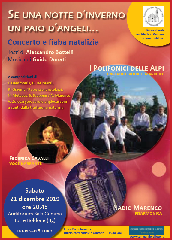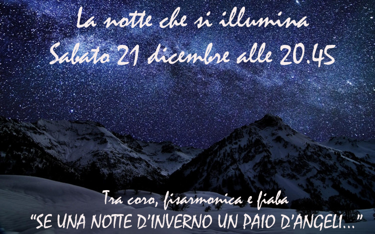 Ultimo incontro della trilogia di Avvento in preparazione del Santo Natale nel sabato sera del 21 dicembre scorso, offerto dalla Parrocchia e svoltosi presso il teatro sala Gamma, con lo spettacolo: “Se una notte d’inverno… un paio d’angeli”, un concerto con canti Alpini, celebri brani della tradizione natalizia e fiaba musicale di Alessandro Bottelli su musica di Guido Donati. Protagonisti della serata con le numerose interpretazioni vocali, il coro “ensemble”dei Polifonici delle Alpi, il fisarmonicista Nadio Marenco e l’attrice Federica Cavalli, che tra deliziose interpretazioni corali e apprezzatissimi canti, hanno presentato la fiaba musicale “se una notte d’inverno un paio d’angeli” scritta dal coordinatore del gruppo, Alessandro Bottelli, musicista, scrittore e poeta.