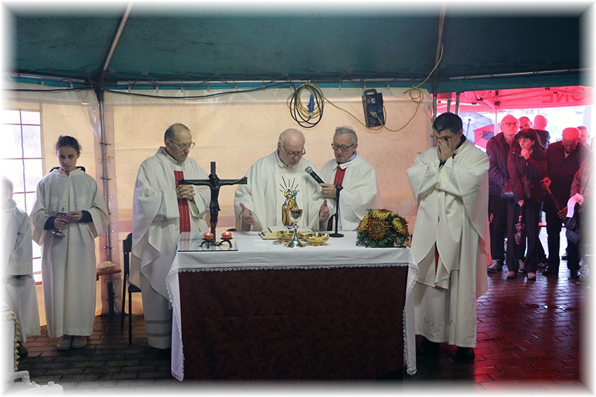 Per proteggere tutti i fedeli che hanno voluto assistere alla messa mattutina, quest’ultima è stata celebrata sotto i tendoni, che poi hanno ospitato il pranzo solidale e poi le bancarelle dei gruppi di volontariato della Parrocchia.