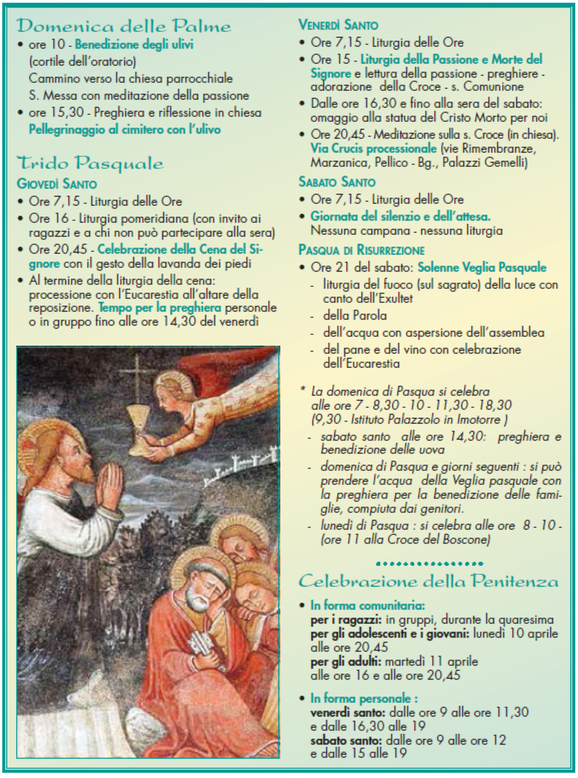 sottolinea l’importanza di ricercare un’acqua pura, un’acqua fresca, un’acqua limpida che abbia veramente a soddisfare questo nostro desiderio delle cose di Dio, dentro il nostro vivere quotidiano. E rilancia un invito, a farci donatori, attenti e generosi, di quest’acqua che disseta, che risana, che rigenera vita e pertanto che abbiamo a donare acqua purificata dalla nostra profonda esperienza di Dio e libera da ogni egoismo, e… che i nostri recipienti non siano bucati, diversamente il nostro dono si disperderebbe lungo il cammino. Domenica 18 alle ore 9,30, visita e condivisione alla comunità dell’Istituto Palazzolo, residenza sanitaria assistita per anziani, in via Donizetti 3. Celebra la liturgia eucaristica il nostro parroco Don Leone, concelebrante Don Piero Garavelli, cappellano dell’Istituto. Sempre numerosissima la partecipazione della comunità e numerosa anche la partecipazione degli ospiti della casa che vengono accompagnati alla chiesa dai familiari e volontari che con puntualità