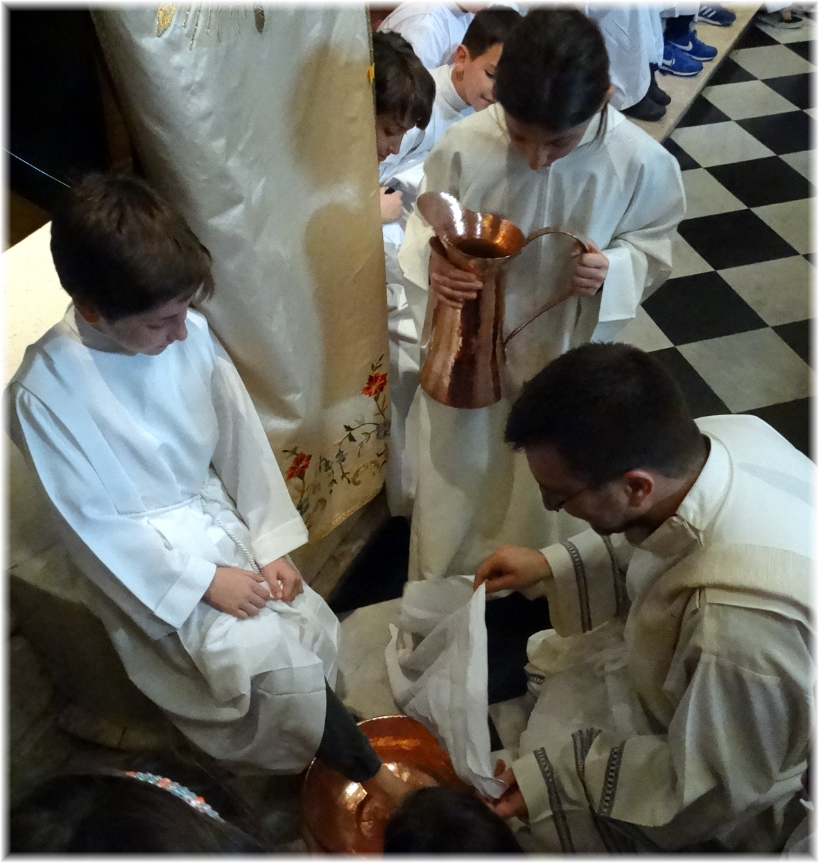 il celebrante, dopo aver invitato l’assemblea a una breve riflessione sul significato della cerimonia che si andava compiendo, dismessa la casula e indossato una grembiule si apprestava a lavare i piedi, nel pomeriggio a tredici prossimi comunicandi, la sera a dodici adolescenti. Significativa la curiosità dei bambini più piccoli che si sono accostati e accalcati attorno al celebrante Don Angelo, per osservare da vicino la semplice cerimonia pomeridiana; emblematico invece l’abbraccio fraterno del celebrante Don Leone agli adolescenti, dopo aver lavato loro i piedi, nella liturgia serale. Le due celebrazioni liturgiche in “COENA DOMINI” sono state allietate dai canti del coretto delle famiglie, nel pomeriggio, e del coro dei giovani nella serata alle quali hanno partecipato numerosi e devoti fedeli.