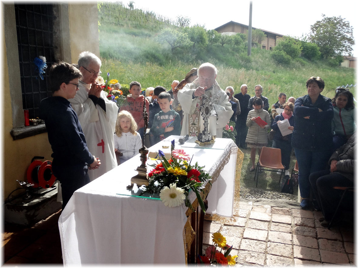 Ospite d’eccezione in questa giornata di festa il nostro Curato degli anni 60, Don Gino Cortesi, che grazie alla sua munificenza a cui va la gratitudine di tutta la comunità, ha permesso il restauro di due quadri, ex voto, presenti nella chiesetta della Ronchella e raffiguranti le vicissitudini storiche del 1600 con la decimazione della popolazione del nostro territorio causata dalla peste. Don Gino ha celebrato la santa Messa solenne delle ore 10, partecipata dal numerosi fedeli e allietata dai canti del nostro coro parrocchiale diretto dal maestro Gaetano, all’organo il maestro Dott. Giuseppe. Dagli atti degli Apostoli cap. 2 apprendiamo come gli apostoli: “Ogni giorno erano perseveranti insieme nel tempio e, spezzando il pane nelle case, prendevano cibo con letizia e semplicità di cuore, lodando Dio e godendo il favore di tutto il popolo”. Dalla Prima lettera di San Pietro Apostolo cap.1 ci viene rivolto un invito: “Perciò esultate di gioia indicibile e gloriosa, mentre raggiungete la mèta della vostra fede: la salvezza delle anime”. Dal vangelo di Giovanni cap. 20: “otto giorni dopo venne Gesù a porte chiuse”, si sottolinea il coraggio di credere: “Gesù gli disse: «Perché mi hai veduto, tu hai creduto; beati quelli che non hanno visto e hanno creduto!». E’ un invito, forte e perentorio, a srotolare la propria vita nella consapevolezza che Gesù vive, è vivo dentro di noi e dentro la nostra storia, e che pertanto “nulla ci mancherà…!”.