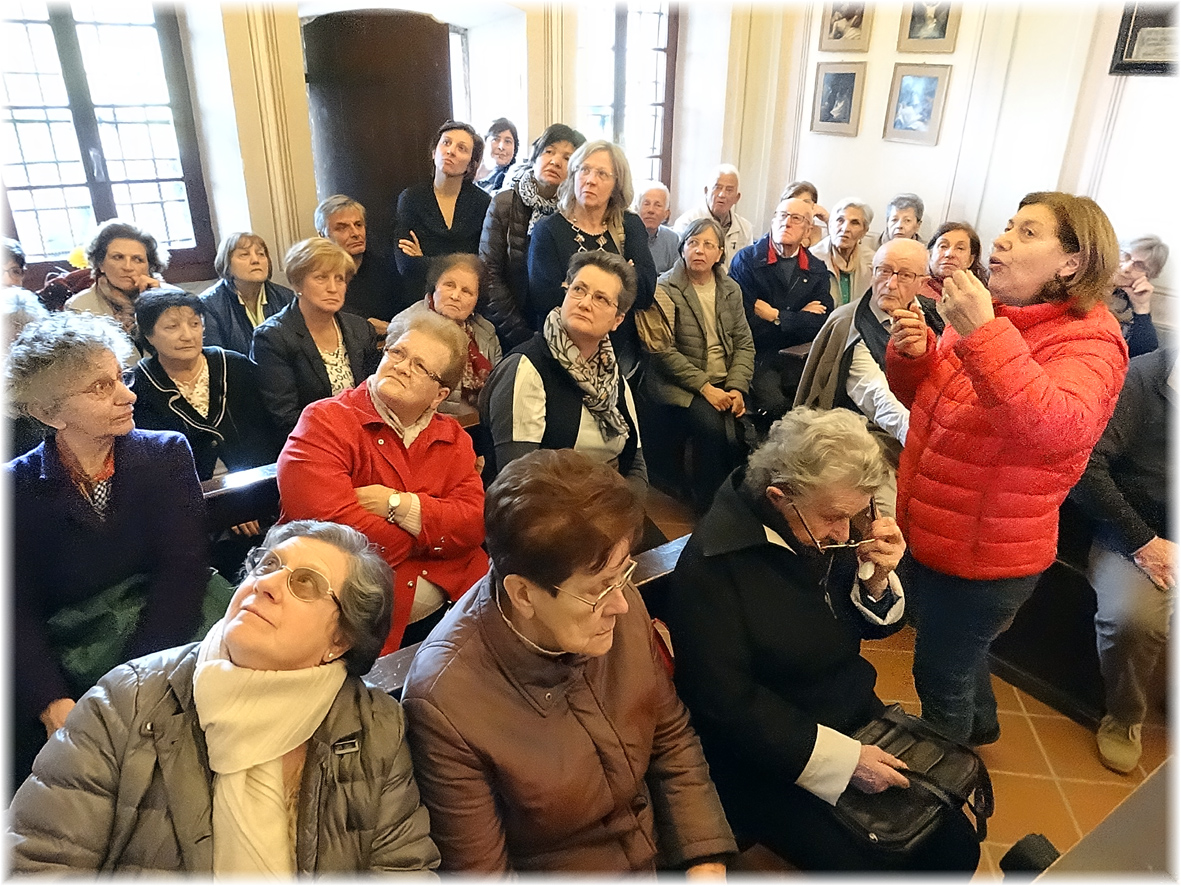 Rosella Ferrari ci ha poi intrattenuto in una interessante visita guidata, all’interno della chiesetta, illustrando con dovizia di particolari i molteplici significati e le variegate raffigurazioni presenti nel luogo sacro, con uno speciale riferimento ai due quadri ex voto, restaurati grazie all’opera intelligente della restauratrice Roberta Grazioli, nei quali si ritrovano i motivi preponderanti di riconoscenza e gratitudine degli scampati alla pestilenza.