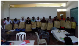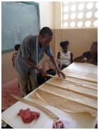 Ogni giorno per due ore quattro gruppetti di donne si alternano per il corso di cucito. Hanno imparato a cucire a mano, hanno iniziato a lavorare con la carta, hanno imparato a prendere le misure e hanno realizzato i primi modelli di gonna.