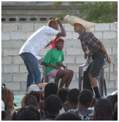 La musica haitiana o hip hop risuona nella sala mentre l’insegnante mostra i passi ad un folto gruppo di ragazze, donne o bambine.
