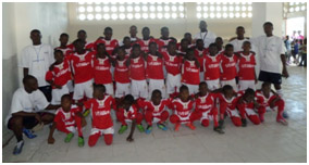 Il fischietto suona e l’allenatore è pronto per iniziare l’allenamento di calcio con i suoi 15 bambini nell’uniforme rossa e bianca che identifica le tre squadre del centro.