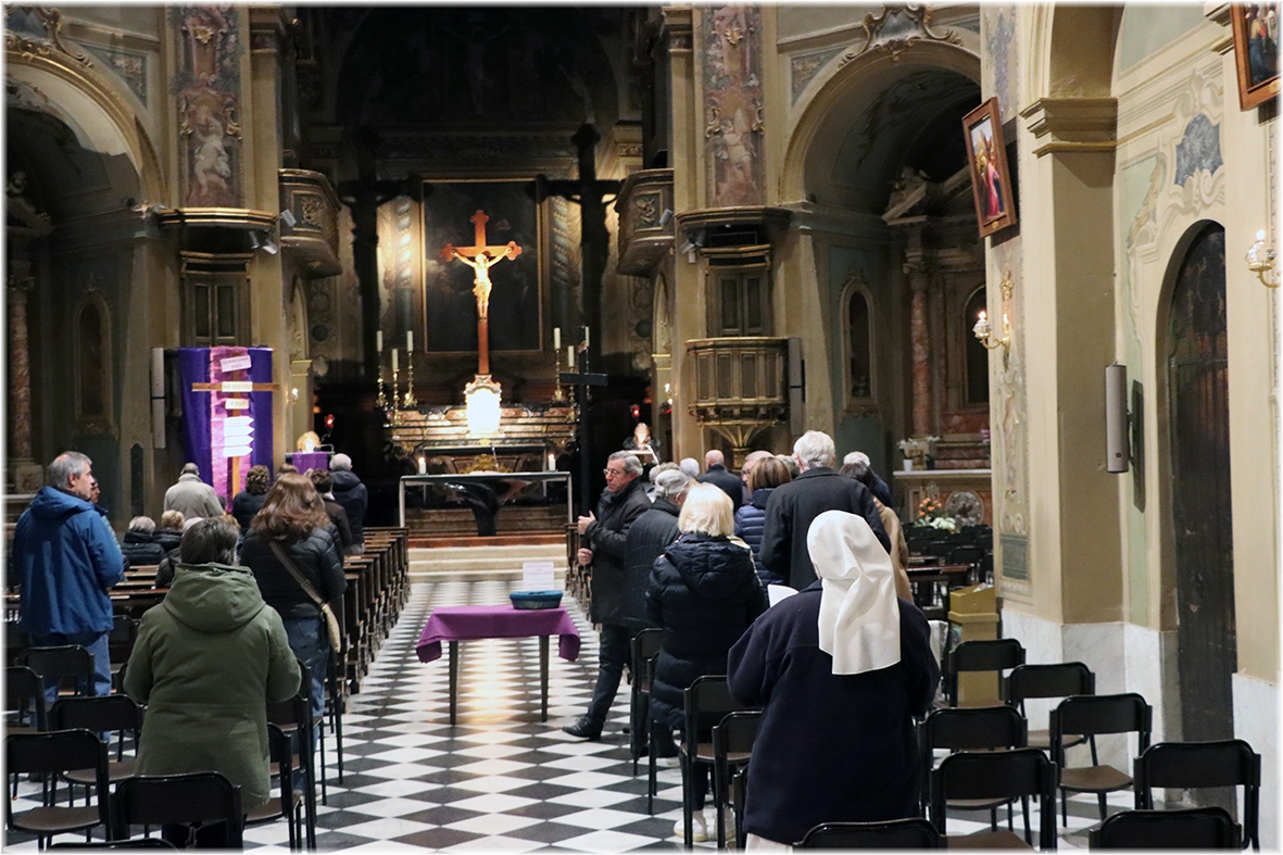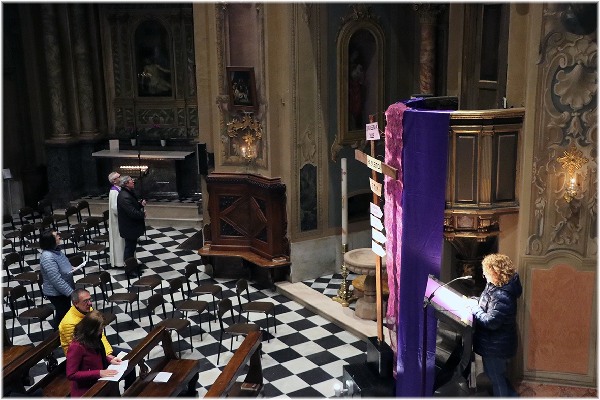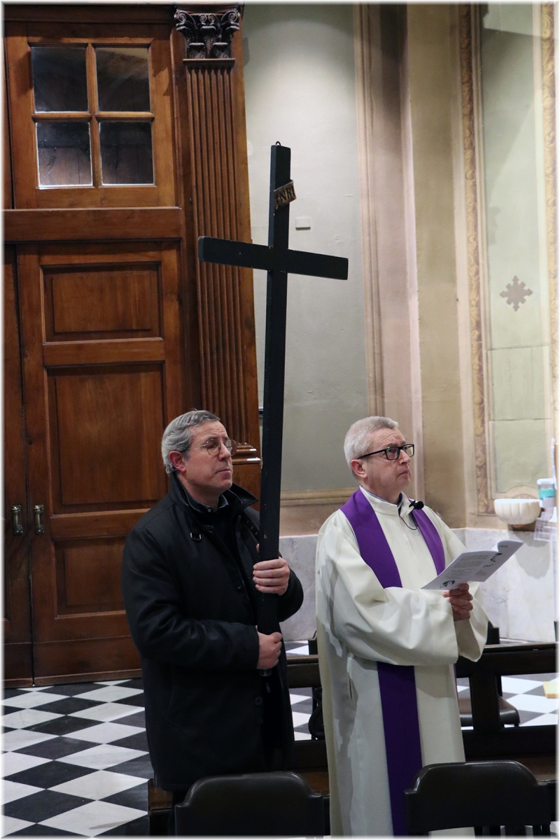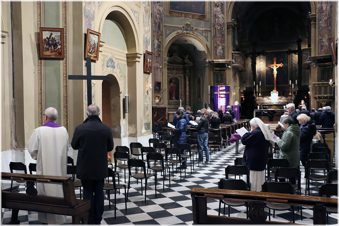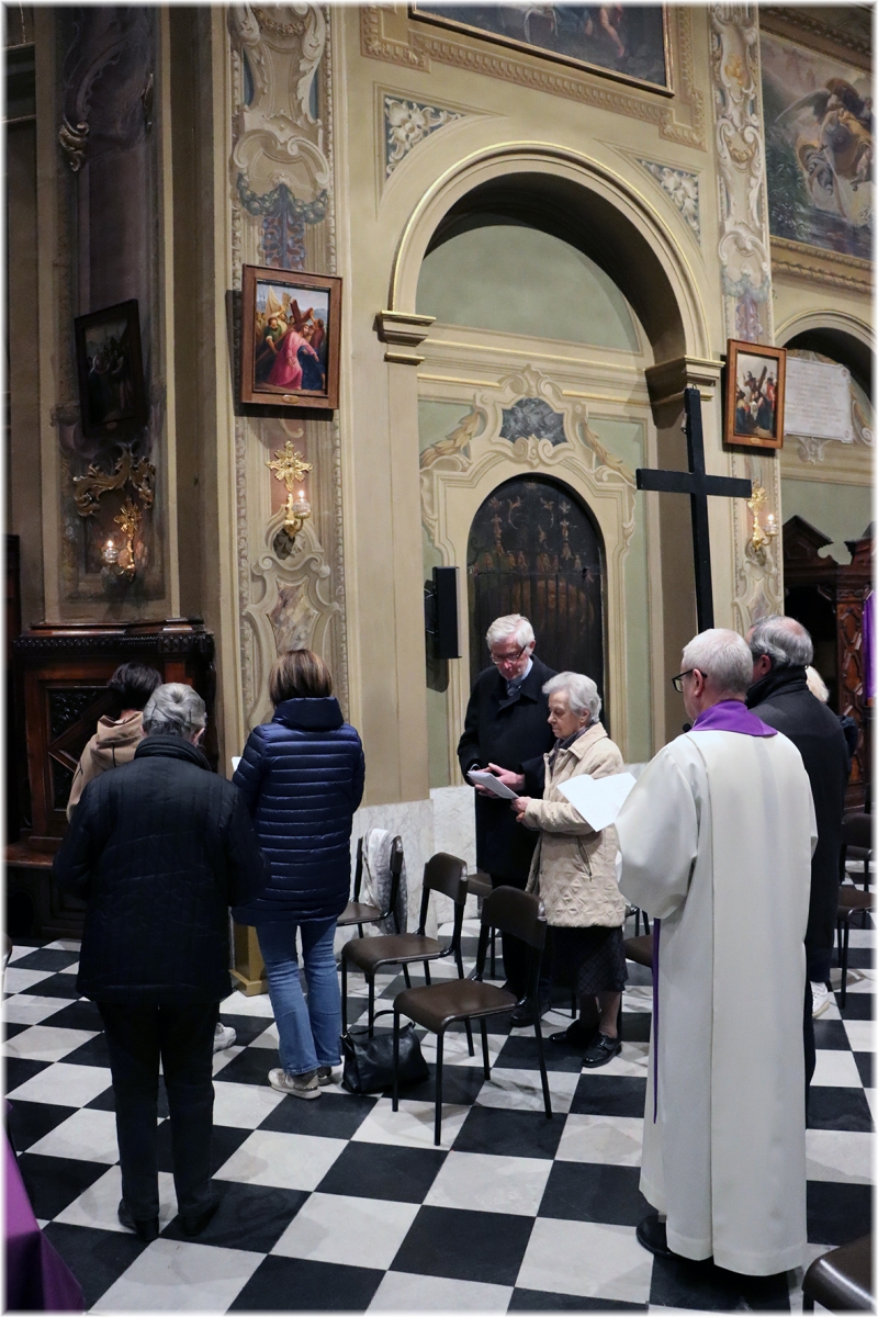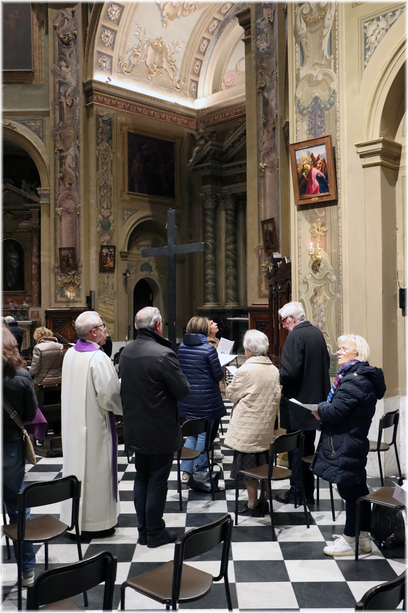 Accompagnati da alcune letture, abbiamo percorso le 14 stazioni, pregando e cantando, soffermandoci con la croce davanti ai quadri posti alle pareti della chiesa. Al termine, don Alessandro ha pregato in particolare per gli ammalati, la pace nel mondo ed ha invitato i fedeli presenti ad un momento di preghiera personale, dove esprimere e raccogliere le proprie intenzioni.