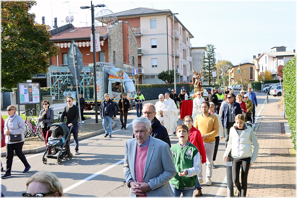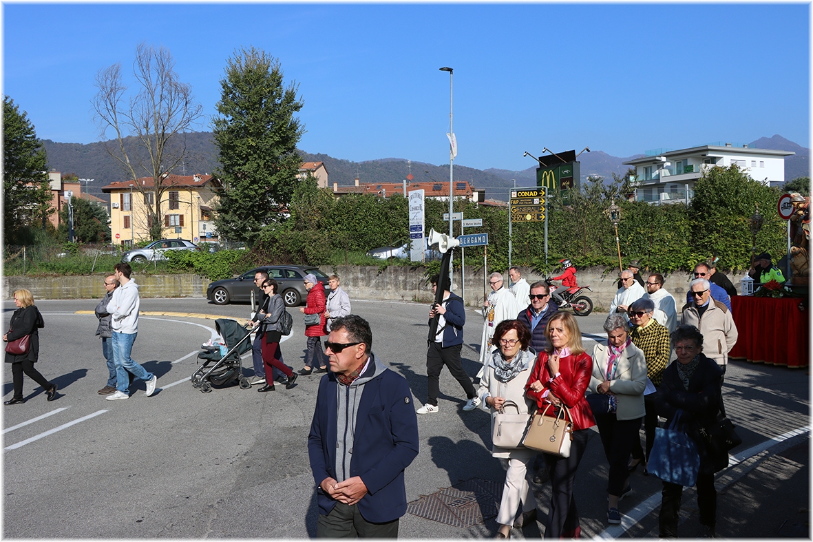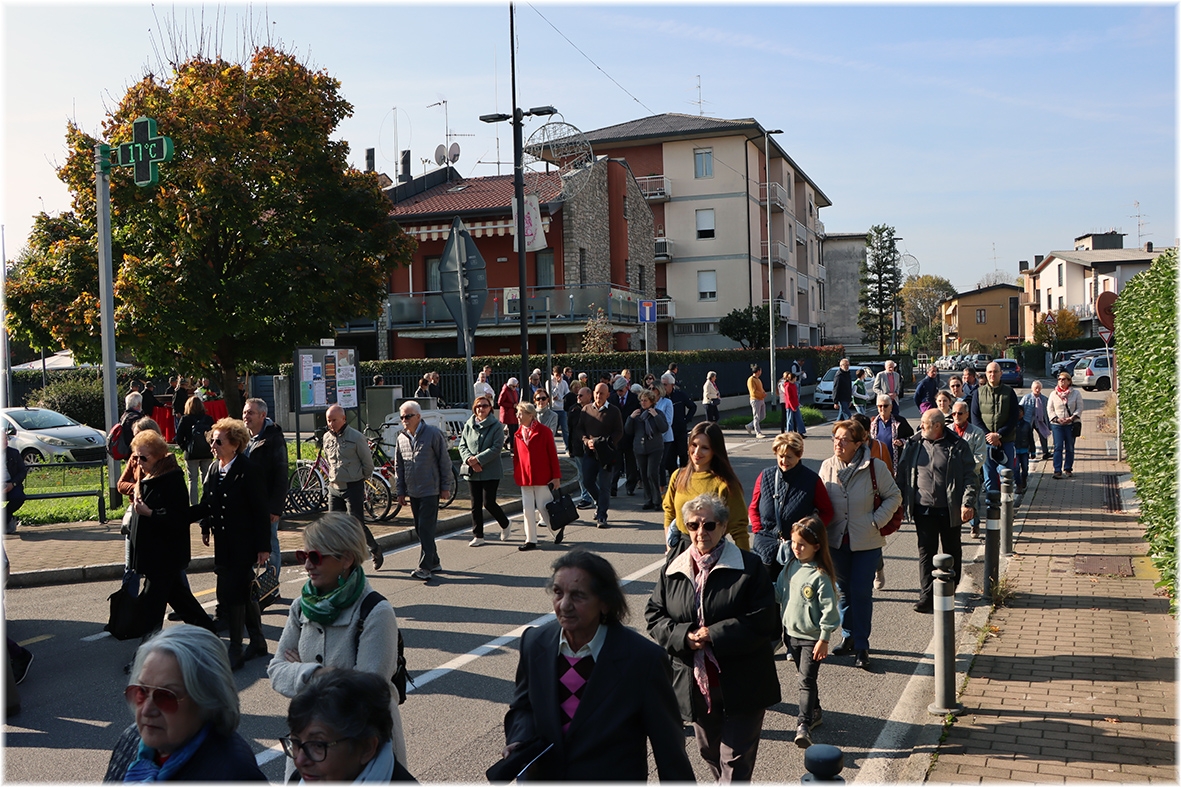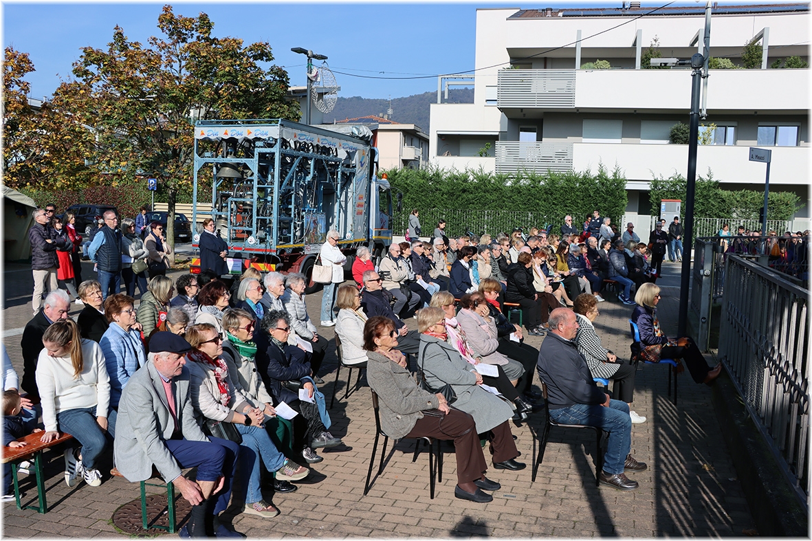 Durante il percorso nelle vie del quartiere, abbiamo pregato il Santo Rosario, alternando il suono delle campane del gruppo “Campanari di Bergamo”, presenti con il loro camion.
