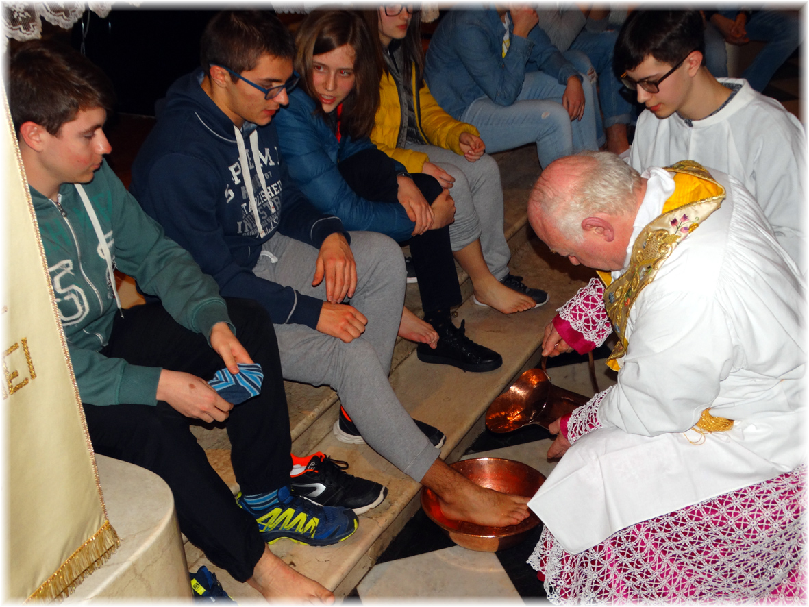 Domini (Giovedì della Cena del Signore). In parrocchia si è celebrato la mattina con la liturgia delle Ore, nel pomeriggio la celebrazione della Cena del Signore rivolta in particolar modo ai ragazzi e la sera la comunità parrocchiale si è riunita attorno alla mensa del Signore, per la medesima liturgia alla quale è seguita la processione con l’Eucaristia all’altare della reposizione e la spogliazione degli altari. Un gesto particolarmente significativo è stato la lavanda dei piedi a quattro animatori del gruppo adolescenti e quattro adolescenti, un numero inusitato per questo rito, che, come ha sottolineato il celebrante Don Leone, non vuole essere un semplice ricordo degli eventi ma la comprensione profonda dell’invito di Gesù a farsi “servitori attenti, fedeli, generosi”. Gesù lava i piedi ai suoi: è un gesto di amore – Gesù dà se stesso in cibo: è il sacramento dell’amore – Il sacerdozio nasce dall’Eucaristia: è il dono per l’unità. La liturgia partecipata con devozione da numerosi fedeli è stata animata dal coro dei “Giovani” con pianola, chitarre e tamburi. L’eucaristia straordinariamente è stata distribuita sotto le specie del pane e del vino.