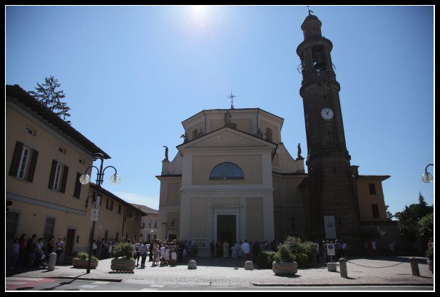 La facciata, molto elegante, si presenta oggi con il corpo di ampliamento progettato da Elia Fornoni. E’ adornata da 8 statue di santi protettori e particolarmente venerati, poste su alti piedestalli alla base dei contrafforti della cupola ottagonale: sono San Martino, S. Margherita, S. Giovanni Battista, S. Ambrogio, S. Celestino Papa, S. Giacomo Apostolo, S. Alessandro, S. Eufrosia.