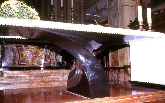 altare nuovoSi tratta di un pezzo unico di marmo nero, semplice e molto elegante, che però pare occupare troppo spazio nel nostro presbiterio, che già ospita il grande altare barocco.
