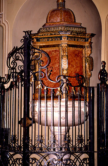 La parte inferiore è costituita da una vasca a forma di coppa, in marmo bianco scolpito,datata dagli esperti al XIXsecolo.