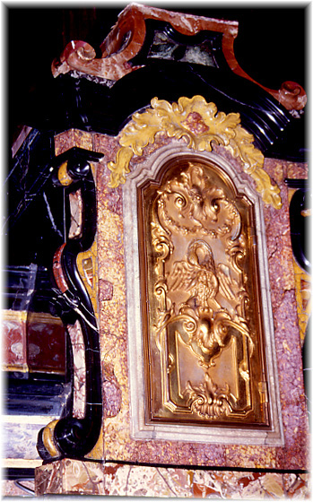 tabernacoloSull’altare spicca, sempre costituito da marmi colorati, il tabernacolo, chiuso da uno sportello in rame dorato e cesellato che raffigura il pellicano che nutre i suoi piccoli con la sua stessa carne.