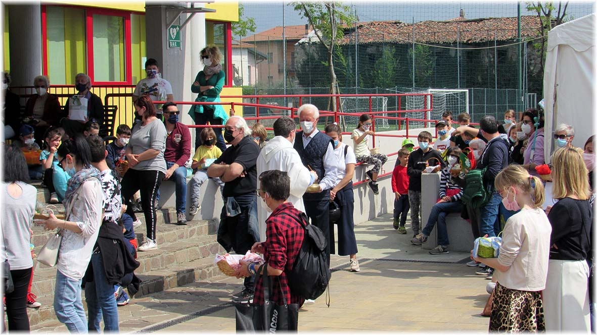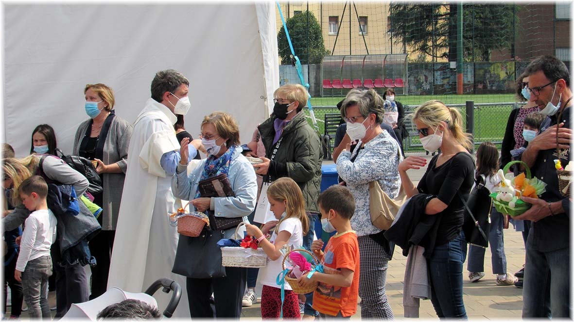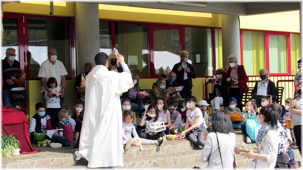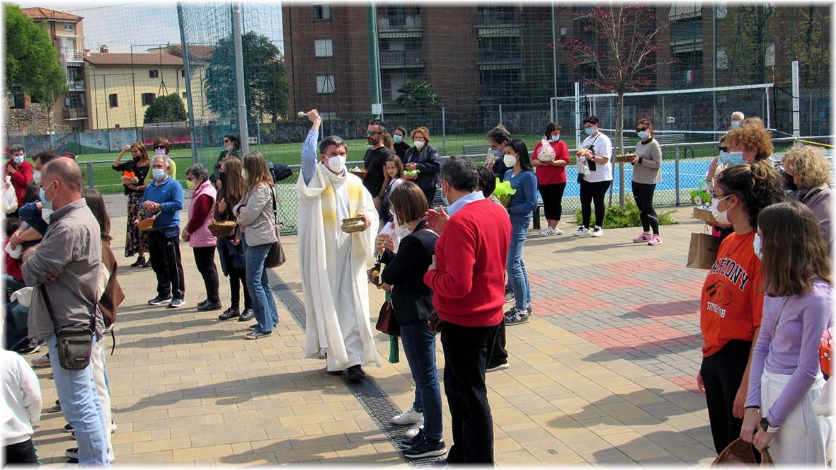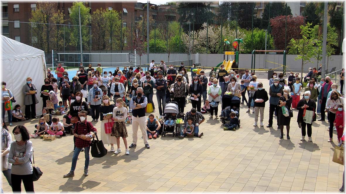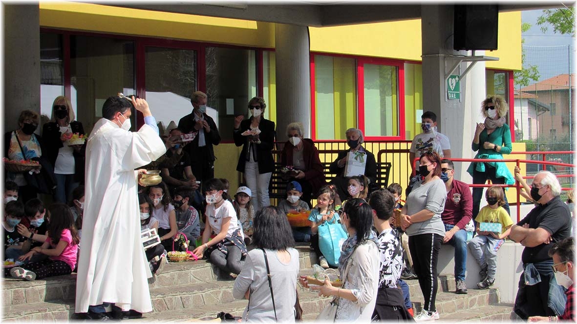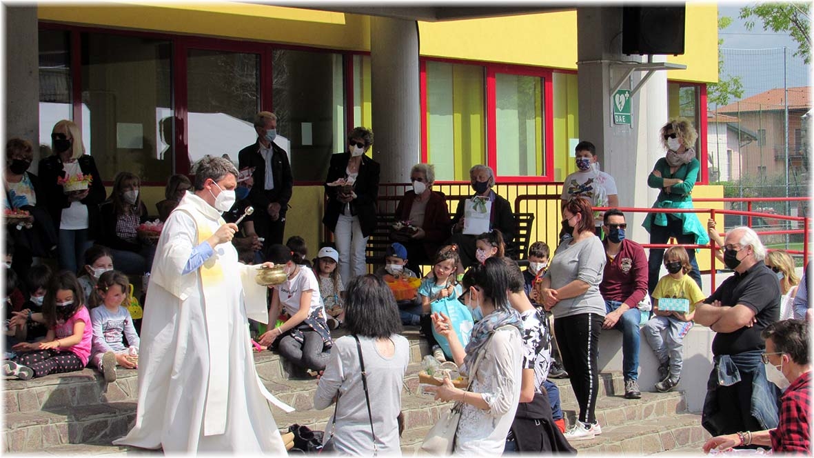 Dopo 2 anni, si è ritornati in presenza alla tradizionale benedizione delle uova, sabato scorso, che con la giornata luminosa e il clima gradevole si è potuta svolgere nel cortile dell’ oratorio.