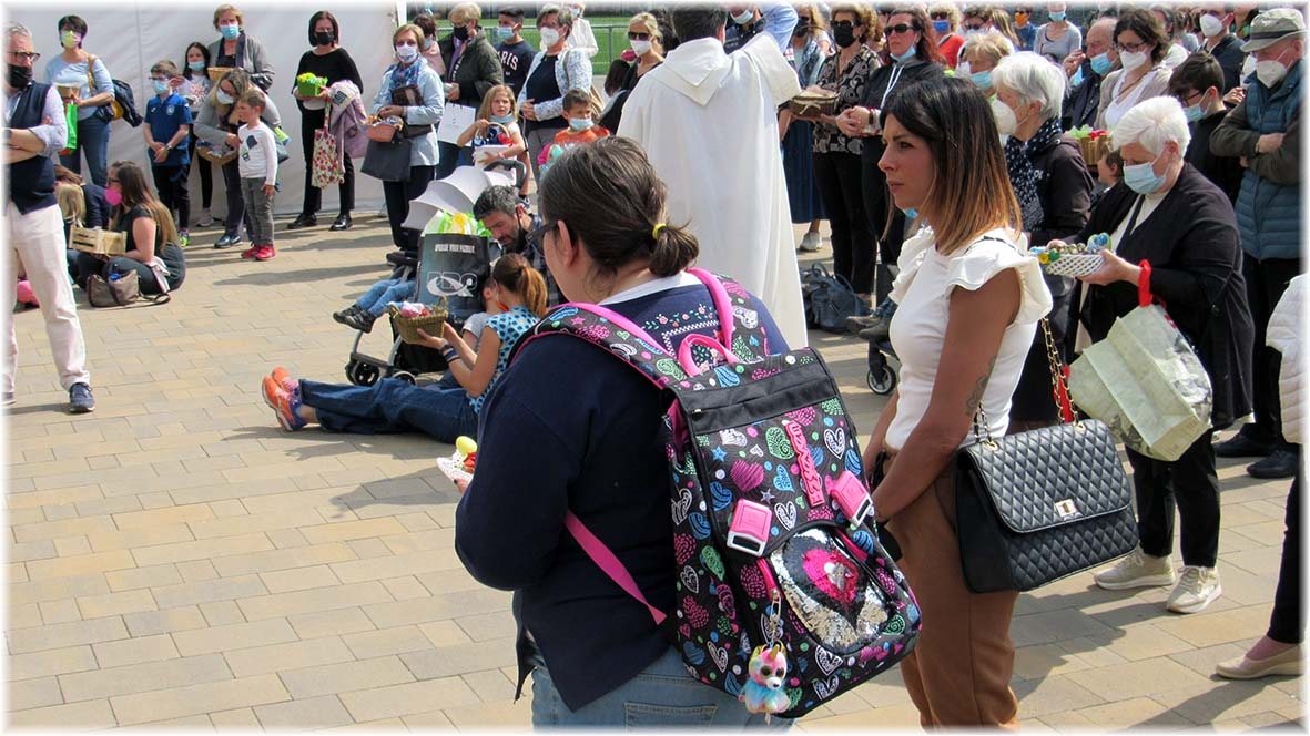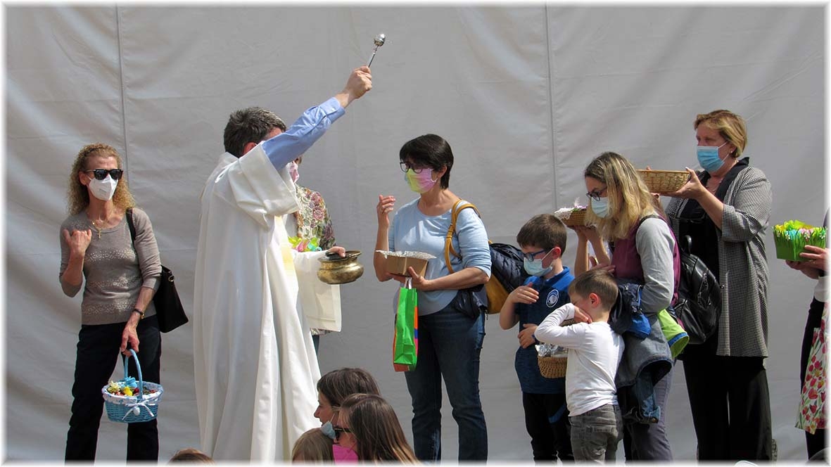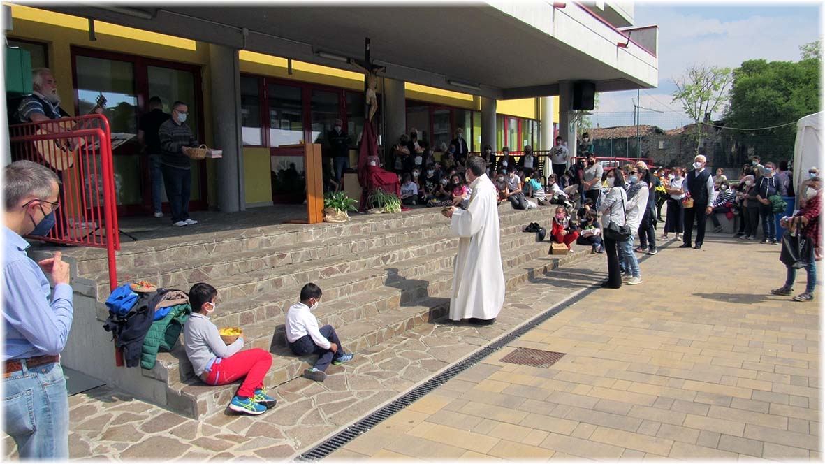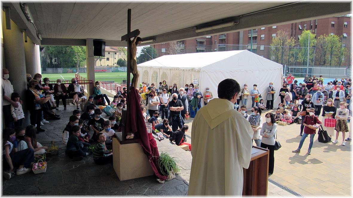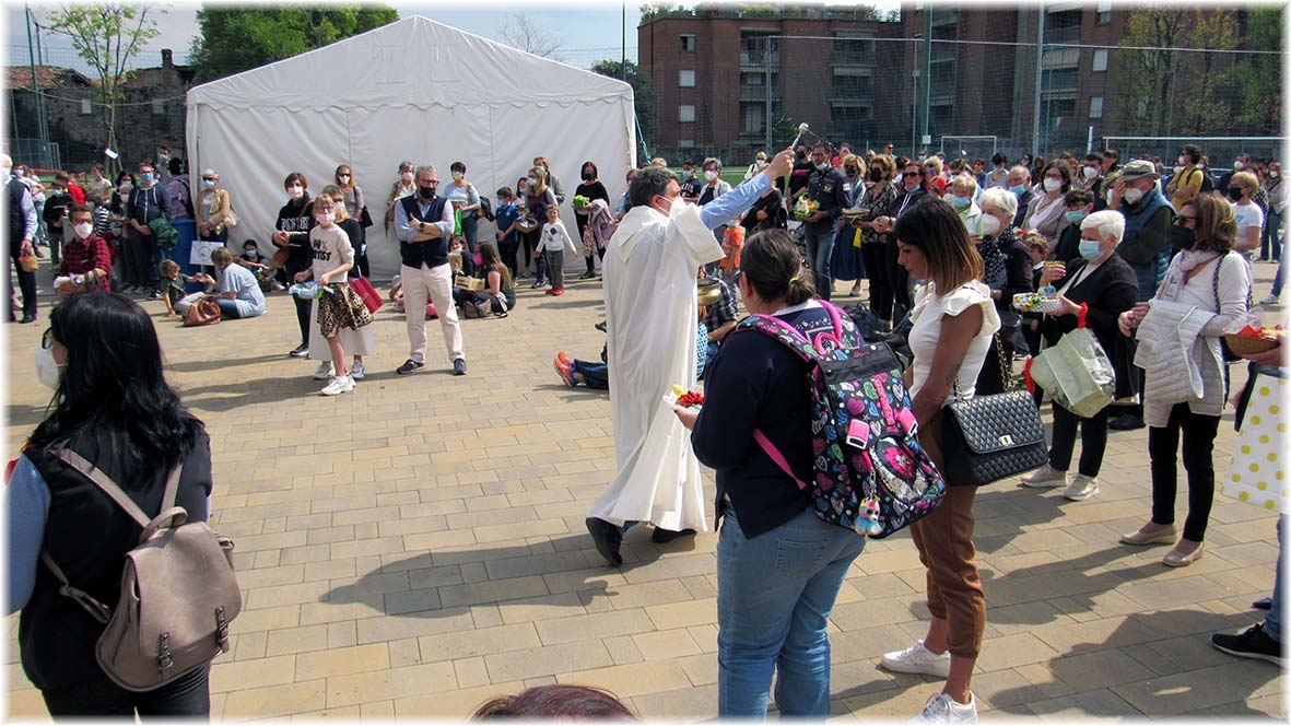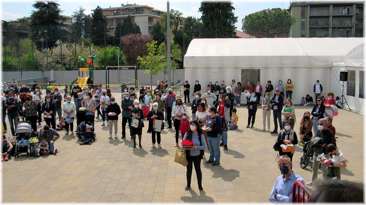 Dopo 2 anni, si è ritornati in presenza alla tradizionale benedizione delle uova, sabato scorso, che con la giornata luminosa e il clima gradevole si è potuta svolgere nel cortile dell’ oratorio.